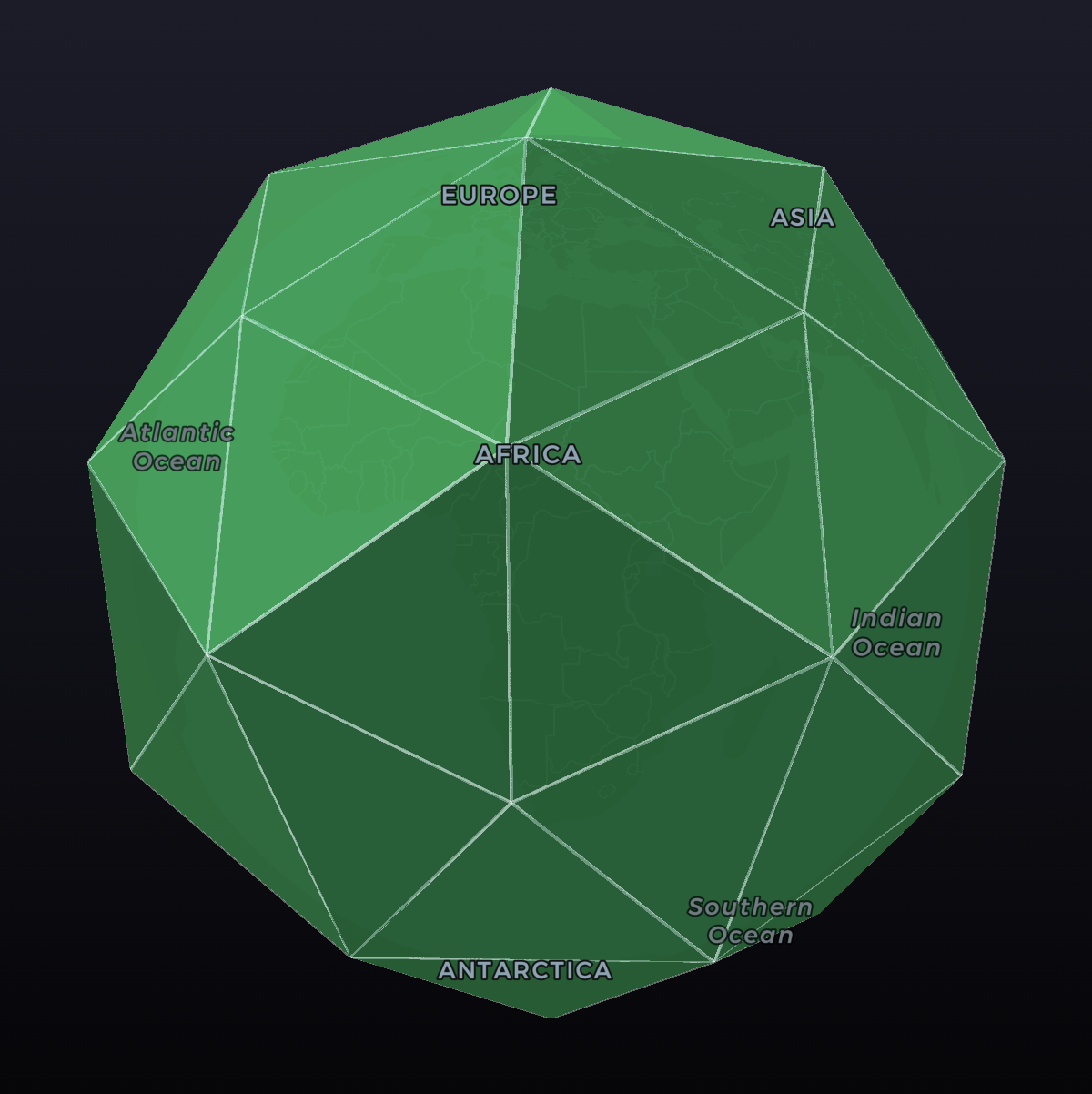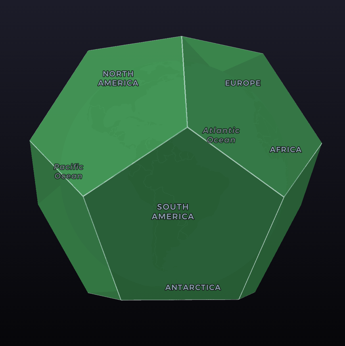 For resolution 1, the globe is divided into 12 cells, with a regular pentagon as the primitive. Together, these form a solid regular dodecahedron, which is a Platonic solid.